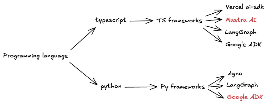 For TypeScript, I'll use Mastra AI, and for Python, I'll use Google ADK, frameworks I've been using more regularly lately.